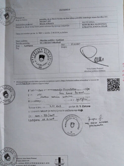 Dobil sem informacijo da overitev naredi Ministrstvo za zunanje zadeve v Ljubljani.