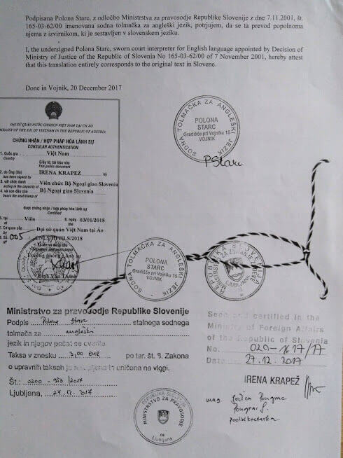 Oba potrdila sta izdana v slovenskem jeziku tako da jih je bilo potrebno prevesti v angleški jezik in potem overiti da bi bila veljavna v Vietnamu.